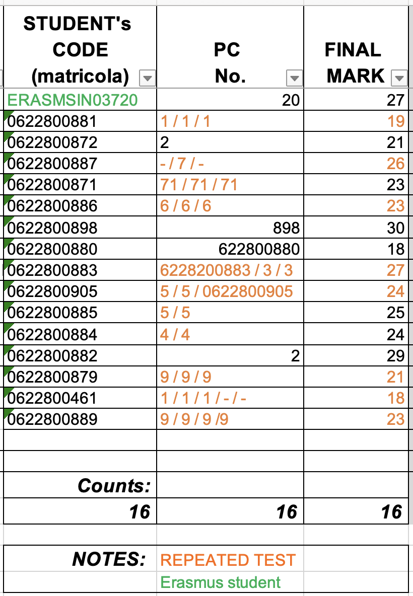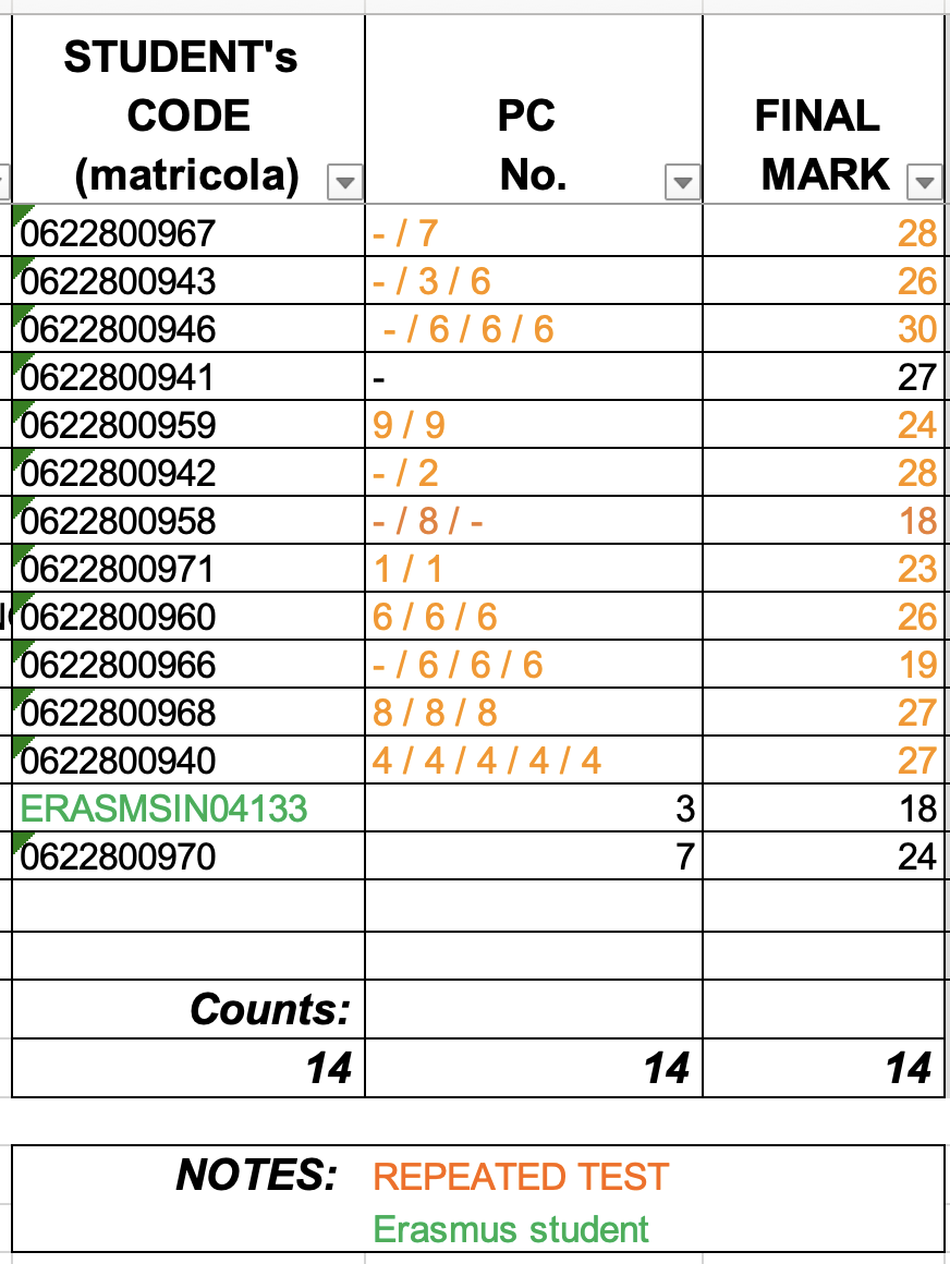 Esiti e voto finale per studenti che hanno seguito il corso in italiano | ||